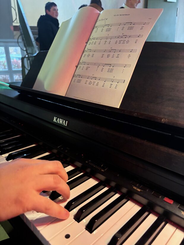 Am letzten Schultag versammelten sich einige Schülerinnen und Schüler im Foyer, um die Weihnachtferien musikalisch einzuläuten. Dabei durften alle mit einem Instrument einsteigen und mitsingen. Herr Müller begleitete das Spektakel auf dem E-Piano.